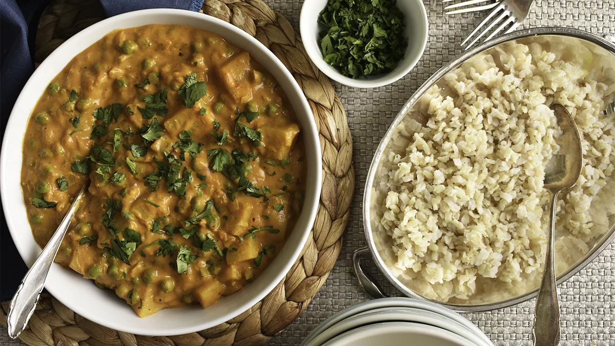 This curry dish features two popular vegetables along with an appealing creamy tomato sauce with Indian spicing. The fenugreek seed powder is key to its success, and you can find it online or in Asian grocery stores.